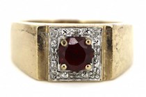 9K YELLOW GOLD, RUBY AND DIAMOND, GENTS RING....