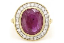 14K YELLOW GOLD RUBY AND DIAMOND HALO RING...