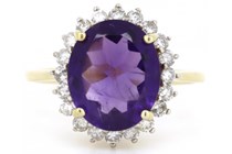14K YELLOW GOLD AMETHYST AND DIAMOND HALO RING...