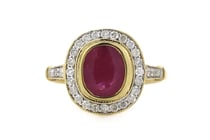 14K YELLOW GOLD, RUBY AND DIAMOND, HALO RING. THE...