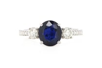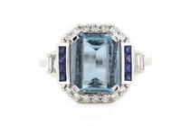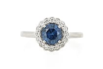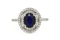 14K WHITE GOLD, BLUE SAPPHIRE AND DIAMOND, HALO...