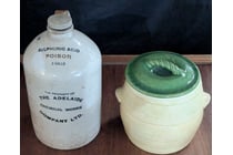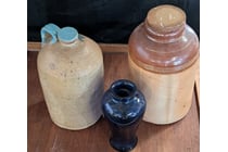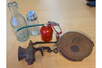 ASSORTED VINTAGE ITEMS INCLUDING GLASS BOTTLES,...