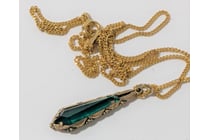 14CT GOLD PENDANT WITH GREEN STONE ON FAUX GOLD...