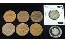 SIX AUSTRALIAN ONE PENNY COINS, 1961 SHILLING AND...
