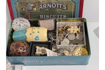 ASSORTED TRINKETS IN ARNOTTS VINTAGE TIN Incl...