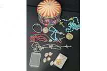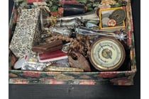 ASSORTED TRINKETS, COINS & JEWELLERY IN FLORAL...