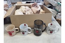 JIM BEAM BRANDED CERAMIC MUGS AND BLACK GLASS...