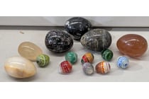 COLLECTION OF POLISHED STONE EGGS AND DECORATIVE...
