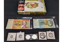 COLLECTION OF CURRENCY IN CIGAR BOX Includes...