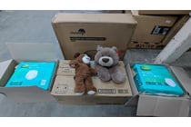 Kids playpen, nappies and two stuffed animals,...