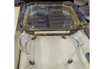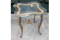 Side table, glass top, metal frame with ornate...