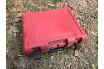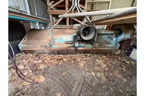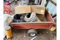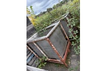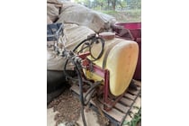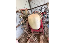 Agricultural spray tank mounted on red metal...