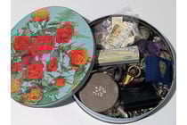 ASSORTED TRINKETS & BADGES IN FLORAL TIN...