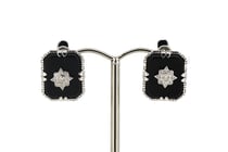 14K WHITE GOLD, ONYX AND DIAMOND, HUGGIE...