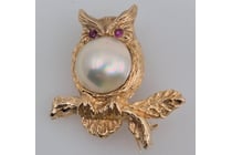 18K YELLOW GOLD BROOCH, OWL SHAPE Featuring 1...