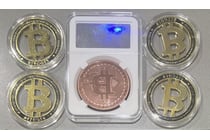 4 X BITCOIN COINS IN CASE AND 1 BITCOIN IN SLAB...