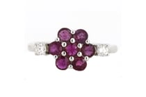 14K WHITE GOLD, RUBY AND DIAMOND, FLORAL RING....
