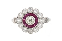 14K WHITE GOLD, DIAMOND AND RUBY, HALO RING....