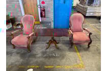 2 x timber carved chairs with red fabrics, 1x...
