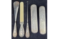 BOX CONTAINING SILVER BRUSHES, BOOT HOOK AND SHOE...