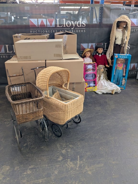 Toys, includes 15 boxes of assorted toys and dolls, doll prams, large free standing dolls and more Sold as lot