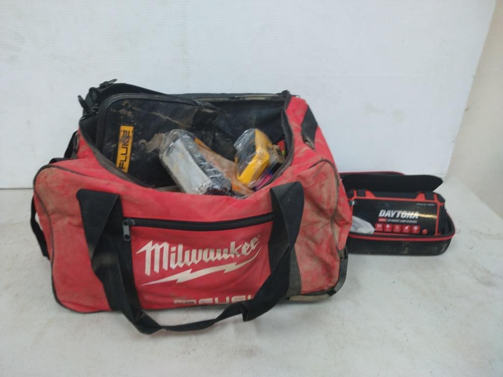 Assorted Tools Accessories In Milwaukee Tool Bag, Including 12V Jump Starter, Multimeter And More