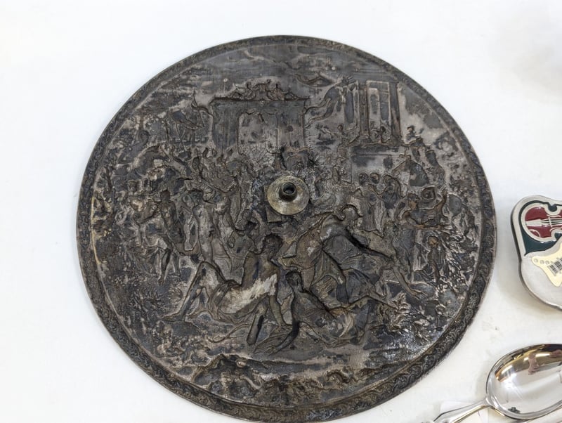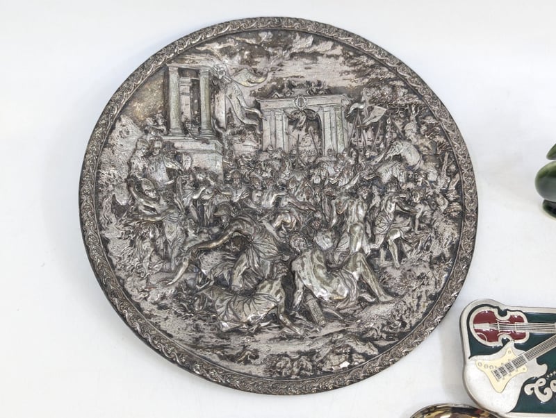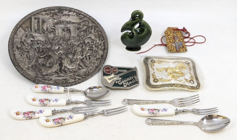 Decorative Belt Buckles, Decorative Plate With Roman Imagery, Arataki Ceramic Statue (Height: 11cm), Decorative Cutlery, CharmsSold As Lot