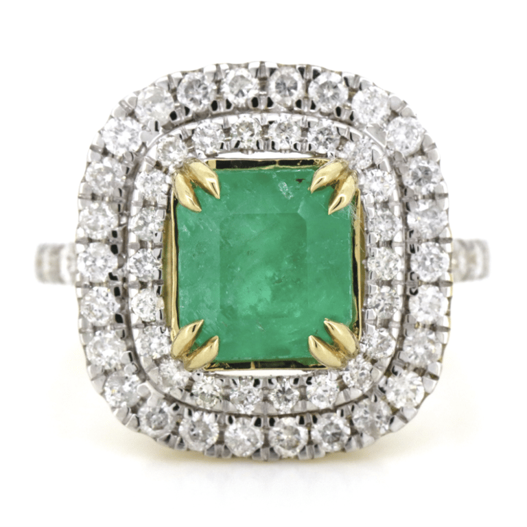 14K YELLOW/WHITE GOLD, 2.44CT COLOMBIAN EMERALD AND DIAMOND, DOUBLE HALO RING. The Centre Features, One Emerald Cut, Bluish-Green, Colombian Emerald (2.44Ct, Included), Double 4 Claw Set. Surrounding The Centre In A Double Halo And Decorating The Band Are, 56 Round Brilliant Cut, Diamonds (0.97Ct Tdw, J-K Colour, Si2-I2 Clarity), Claw Set In White Gold. Ring Size M. Valuations Provided by an Independent Third-Party Professional Not Directly Associated With Lloyds Auctions at AUD $$18,290.00This valuation has been conducted by an independent third-party professional. The valuation amount is an assessment by the issuing valuer and does not reflect the auction value of the item. Any inquiries regarding the valuation should be directed to the issuing valuer (refer to contact details on the certificate), as Lloyds Auctions has no affiliation or influence over the valuation, the valuer, or the stated amount. Condition: Good - Refer Images 0645839+1449
