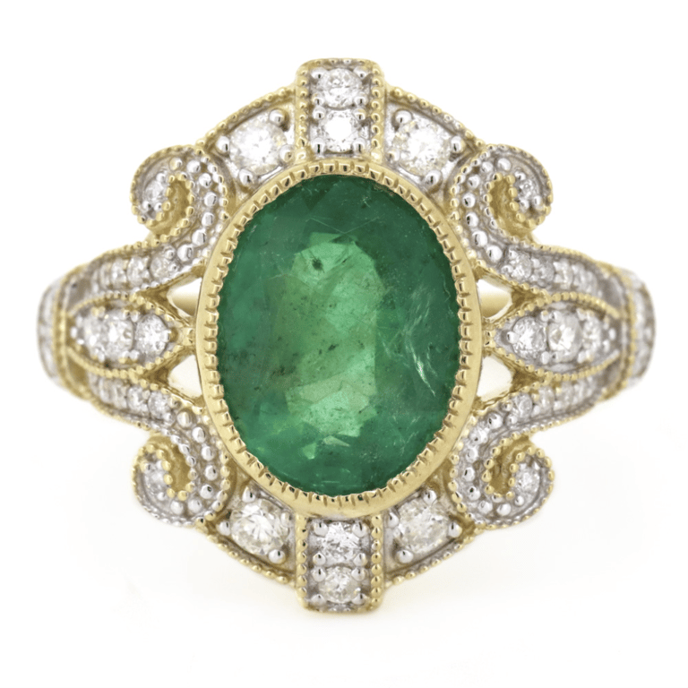14K YELLOW GOLD, 2.89CT ZAMBIAN EMERALD AND DIAMOND, ANTIQUE INSPIRED RING. The Centre Features, One Oval Cut, Deep Intense Blue Green, Zambian Emerald (2.89Ct, Slightly Included), Bezel Set With Millegrain Detail. Encompassing The Design Are, 46 Round Brilliant Cut, Diamonds (0.52Ct Tdw, G-H Colour, Si1-Si2 Clarity), Bead Set In White Gold With Millegrain Detail. Ring Size N 1/2. Valuations Provided by an Independent Third-Party Professional Not Directly Associated With Lloyds Auctions at AUD $$26,000.00This valuation has been conducted by an independent third-party professional. The valuation amount is an assessment by the issuing valuer and does not reflect the auction value of the item. Any inquiries regarding the valuation should be directed to the issuing valuer (refer to contact details on the certificate), as Lloyds Auctions has no affiliation or influence over the valuation, the valuer, or the stated amount. Condition: Good - Refer Images 0645839+1463