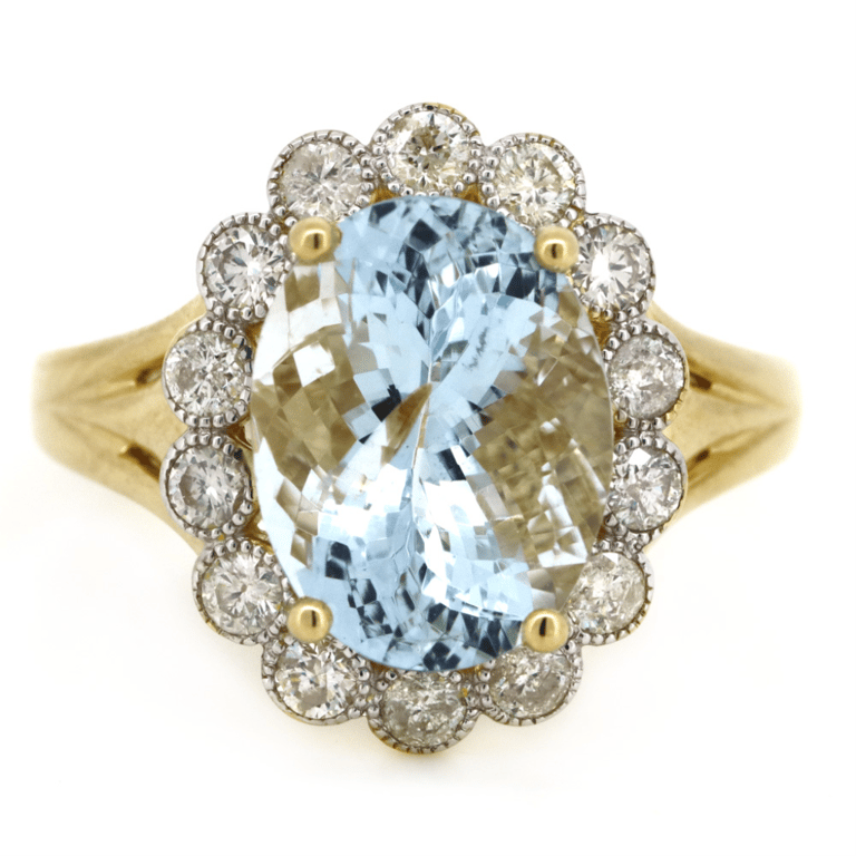 14K YELLOW GOLD, AQUAMARINE AND DIAMOND, HALO RING. The Centre Features, One Oval Cut, Light Greyish-Blue, Aquamarine (4.37Ct, Very Minor Eye Visible Inclusions), Claw Set. Surrounding The Centre In A Halo Are, 14 Round Brilliant Cut, Diamonds (0.60Ct Tdw, J-K Colour, Si2-I2 Clarity), Bezel Set In White Gold With Millegrain Detail. Ring Size O. Valuations Provided by an Independent Third-Party Professional Not Directly Associated With Lloyds Auctions at AUD $$9,390.00This valuation has been conducted by an independent third-party professional. The valuation amount is an assessment by the issuing valuer and does not reflect the auction value of the item. Any inquiries regarding the valuation should be directed to the issuing valuer (refer to contact details on the certificate), as Lloyds Auctions has no affiliation or influence over the valuation, the valuer, or the stated amount. Condition: Good - Refer Images 0645839+1453