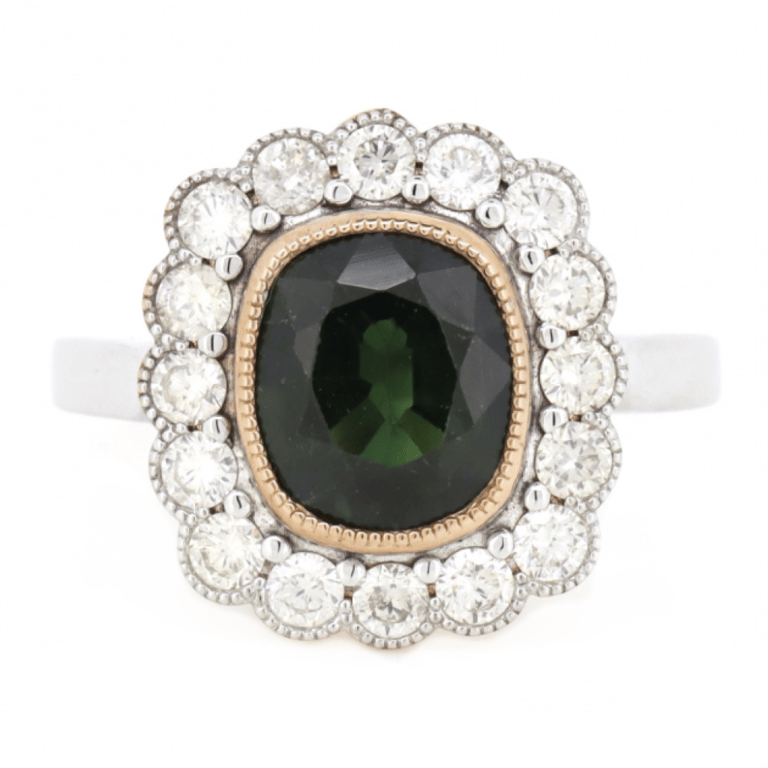 14K WHITE/ROSE GOLD, GREEN SAPPHIRE AND DIAMOND, HALO RING. The Centre Features, One Oval Cut, Bluish-Green, Sapphire (2.50Ct, Minor Eye Visible Inclusions), Bezel Set In Rose Gold With Millegrain Detail. Surrounding The Centre In A Halo Are, 16 Round Brilliant Cut, Diamonds (0.79Ct Tdw, J-K Colour, Si2-I2 Clarity), Semi-Bezel/Bead Set With Millegrain Detail. Ring Size N. Valuations Provided by an Independent Third-Party Professional Not Directly Associated With Lloyds Auctions at AUD $$10,590.00This valuation has been conducted by an independent third-party professional. The valuation amount is an assessment by the issuing valuer and does not reflect the auction value of the item. Any inquiries regarding the valuation should be directed to the issuing valuer (refer to contact details on the certificate), as Lloyds Auctions has no affiliation or influence over the valuation, the valuer, or the stated amount. Condition: Good - Refer Images 0645839+1481