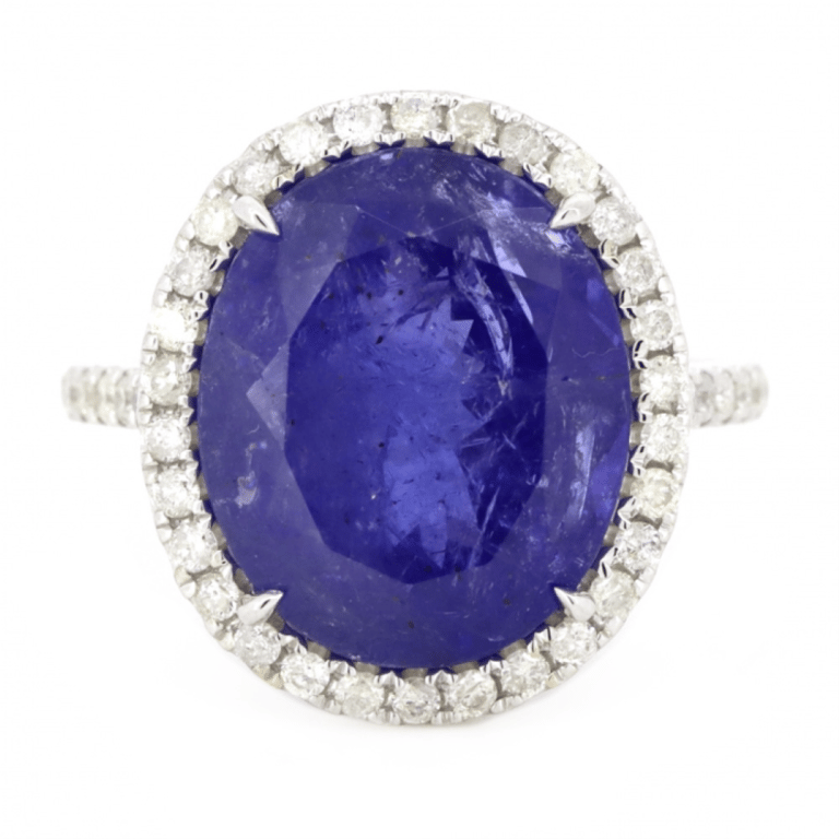 14K WHITE GOLD, 10.09CT TANZANITE AND DIAMOND, STATEMENT RING. The Centre Features, One Oval Cut, Purplish-Blue, Tanzanite (10.09Ct, Included), 4 Claw Set. Surrounding The Centre In A Halo And Decorating The Band Are, 46 Round Brilliant Cut, Diamonds (0.52Ct Tdw, J-K Colour, Si2-I2 Clarity), Micro-Claw Set. Ring Size M 1/2.The Tanzanite Has Some Very Small Natural Inclusions That Have Reached The Surface. Valuations Provided by an Independent Third-Party Professional Not Directly Associated With Lloyds Auctions at AUD $$15,390.00This valuation has been conducted by an independent third-party professional. The valuation amount is an assessment by the issuing valuer and does not reflect the auction value of the item. Any inquiries regarding the valuation should be directed to the issuing valuer (refer to contact details on the certificate), as Lloyds Auctions has no affiliation or influence over the valuation, the valuer, or the stated amount. Condition: Good - Refer Images 0645839+1423