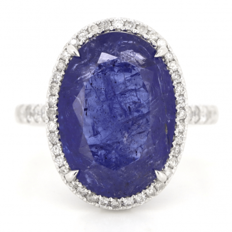 14K WHITE GOLD, 9.51CT TANZANITE AND DIAMOND, STATEMENT RING. The Centre Features, One Oval Cut, Medium Dark Purplish-Blue, Tanzanite (9.51Ct, Included), 4 Claw Set. Surrounding The Centre In A Halo And Decorating The Band Are, 54 Round Brilliant Cut, Diamonds (0.42Ct Tdw, J-K Colour, Si2-I2 Clarity), Micro-Claw Set. Ring Size M. Valuations Provided by an Independent Third-Party Professional Not Directly Associated With Lloyds Auctions at AUD $$15,290.00This valuation has been conducted by an independent third-party professional. The valuation amount is an assessment by the issuing valuer and does not reflect the auction value of the item. Any inquiries regarding the valuation should be directed to the issuing valuer (refer to contact details on the certificate), as Lloyds Auctions has no affiliation or influence over the valuation, the valuer, or the stated amount. Condition: Good - Refer Images 0645839+1428