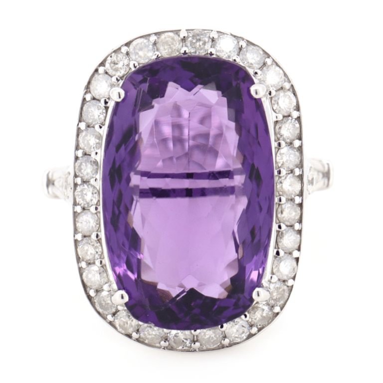 14K WHITE GOLD, 8.68CT AMETHYST AND DIAMOND, STATEMENT RING. The Centre Features, One Rectangular Cushion Cut, Deep Purple, Amethyst (8.68Ct, Eye Clean Clarity), Claw Set. Surrounding The Centre And Decorating The Shoulders Are, 32 Round Brilliant Cut, Diamonds (0.90Ct Tdw, I-K Colour, Si2-P2 Clarity), Bead Set. Ring Size P. Valuations Provided by an Independent Third-Party Professional Not Directly Associated With Lloyds Auctions at AUD $$12,750.00This valuation has been conducted by an independent third-party professional. The valuation amount is an assessment by the issuing valuer and does not reflect the auction value of the item. Any inquiries regarding the valuation should be directed to the issuing valuer (refer to contact details on the certificate), as Lloyds Auctions has no affiliation or influence over the valuation, the valuer, or the stated amount. Condition: Good - Refer Images 0645839+1467