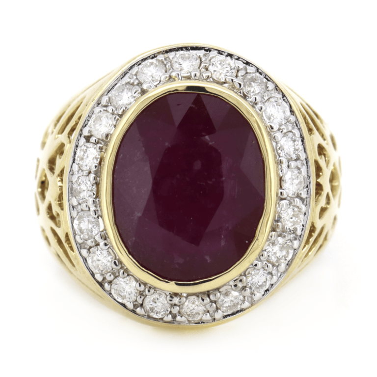 14K YELLOW GOLD, 7.98CT RUBY AND DIAMOND, STATEMENT RING. The Centre Features, One Oval Cut, Deep Pinkish-Red, Ruby (7.98Ct, Enhanced, Included), Bezel Set. Surrounding The Centre In A Halo Are, 20 Round Brilliant Cut, Diamonds (0.63Ct Tdw, I-K Colour, Si2-P2 Clarity), Bead Set. Ring Size R. Valuations Provided by an Independent Third-Party Professional Not Directly Associated With Lloyds Auctions at AUD $$15,250.00This valuation has been conducted by an independent third-party professional. The valuation amount is an assessment by the issuing valuer and does not reflect the auction value of the item. Any inquiries regarding the valuation should be directed to the issuing valuer (refer to contact details on the certificate), as Lloyds Auctions has no affiliation or influence over the valuation, the valuer, or the stated amount. Condition: Good - Refer Images 0645839+1492