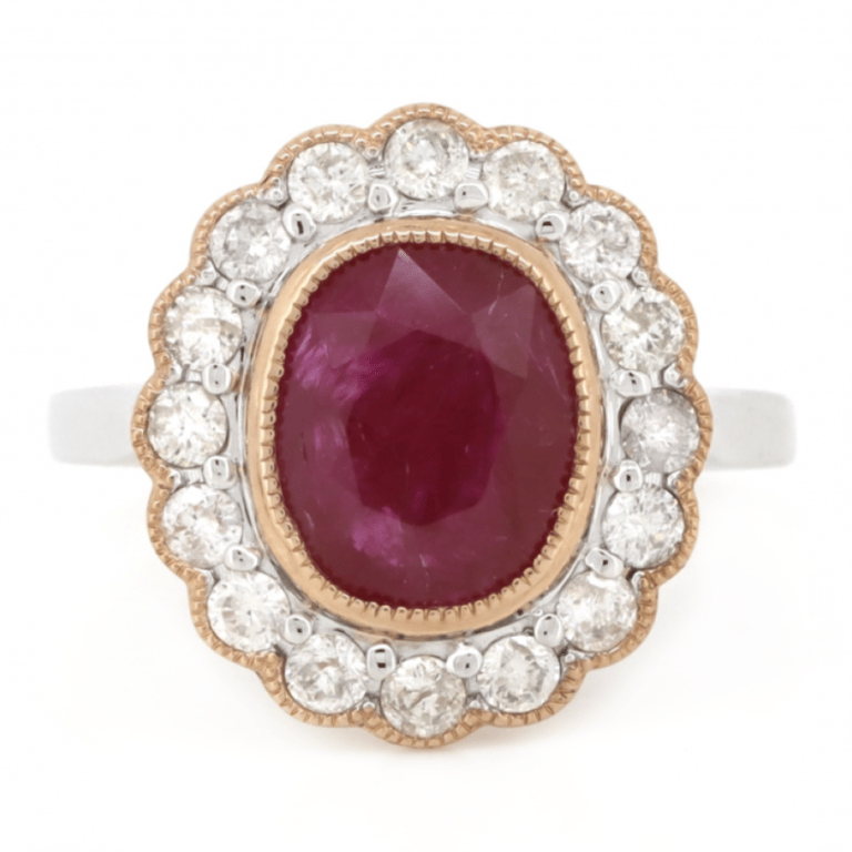14K WHITE/ROSE GOLD, RUBY AND DIAMOND, HALO RING. The Centre Features, One Oval Cut, Purplish-Red, Ruby (3.11Ct, Included), Bezel Set In Rose Gold With Millegrain Detail. Surrounding The Centre In A Halo Are, 16 Round Brilliant Cut, Diamonds (0.74Ct Tdw, J-K Colour, Si2-I2 Clarity), Semi-Bezel/Bead Set With Millegrain Detail. Ring Size O. Valuations Provided by an Independent Third-Party Professional Not Directly Associated With Lloyds Auctions at AUD $$12,890.00This valuation has been conducted by an independent third-party professional. The valuation amount is an assessment by the issuing valuer and does not reflect the auction value of the item. Any inquiries regarding the valuation should be directed to the issuing valuer (refer to contact details on the certificate), as Lloyds Auctions has no affiliation or influence over the valuation, the valuer, or the stated amount. Condition: Good - Refer Images 0645839+1471