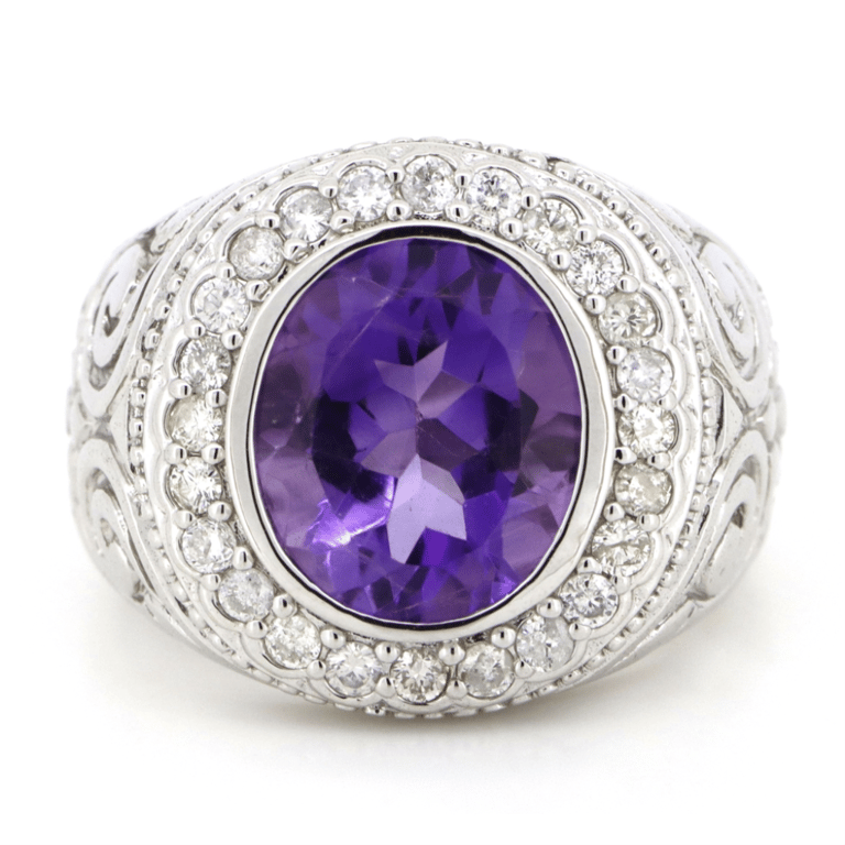 14K WHITE GOLD, AMETHYST AND DIAMOND, DRESS RING. The Centre Features, One Oval Cut, Medium Purple, Amethyst (4.14Ct, Eye Clean Clarity), Bezel Set. Surrounding The Centre In A Halo Are, 24 Round Brilliant Cut, Diamonds (0.53Ct Tdw, H-I Colour, Si1-I2 Clarity), Bead Set. Ring Size P 1/2. Valuations Provided by an Independent Third-Party Professional Not Directly Associated With Lloyds Auctions at AUD $$9,590.00This valuation has been conducted by an independent third-party professional. The valuation amount is an assessment by the issuing valuer and does not reflect the auction value of the item. Any inquiries regarding the valuation should be directed to the issuing valuer (refer to contact details on the certificate), as Lloyds Auctions has no affiliation or influence over the valuation, the valuer, or the stated amount. Condition: Good - Refer Images 0645839+1408
