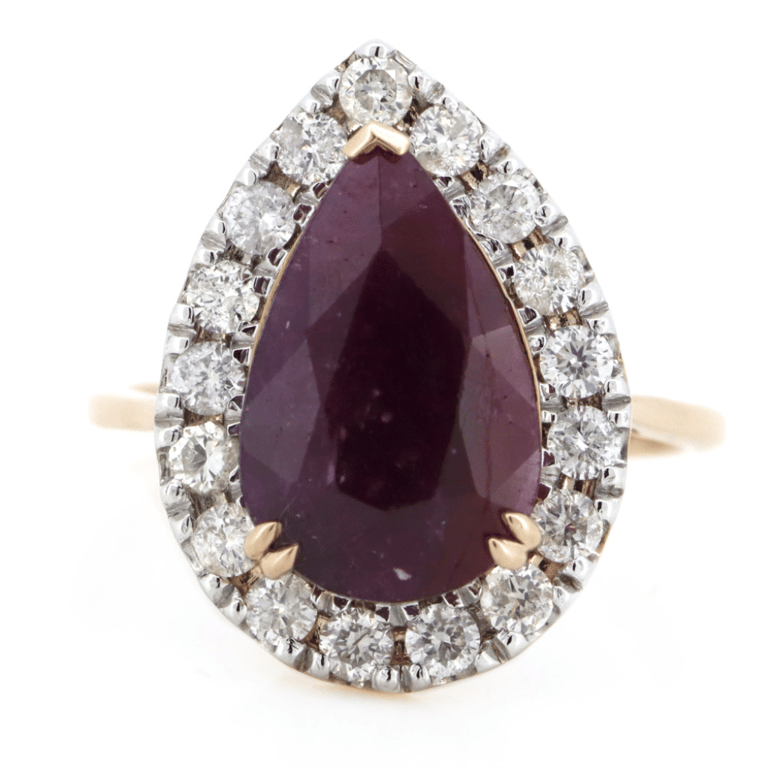 14K ROSE GOLD, RUBY AND DIAMOND, HALO RING. The Centre Features, One Pear Cut, Medium Dark Purplish-Red, Ruby (2.415Ct, Included), Double 3 Claw Set. Surrounding The Centre In A Halo Are, 17 Round Brilliant Cut, Diamonds (0.69Ct Tdw, J-K Colour, Si2-I2 Clarity), Micro-Claw Set In White Gold. Ring Size M. Valuations Provided by an Independent Third-Party Professional Not Directly Associated With Lloyds Auctions at AUD $$9,790.00This valuation has been conducted by an independent third-party professional. The valuation amount is an assessment by the issuing valuer and does not reflect the auction value of the item. Any inquiries regarding the valuation should be directed to the issuing valuer (refer to contact details on the certificate), as Lloyds Auctions has no affiliation or influence over the valuation, the valuer, or the stated amount. Condition: Good - Refer Images 0645839+1477