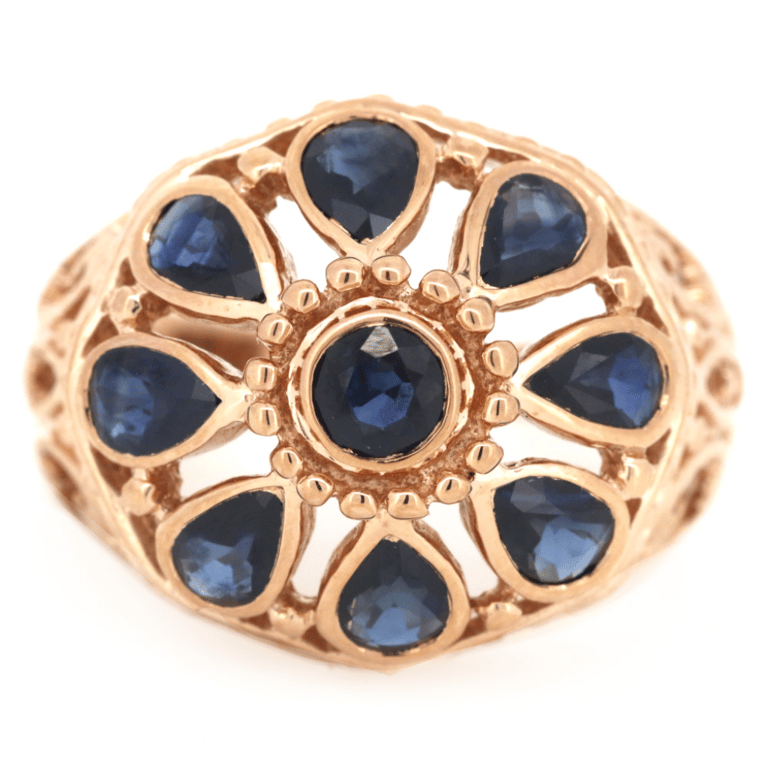 14K ROSE GOLD AND BLUE SAPPHIRE, ART DECO INSPIRED RING. The Design Features, One Round And 8 Pear Cut, Sapphires (1.77Ct Tsw, Minor Eye Visible Inclusions), Bezel/Bead Set. Ring Size M. Valuations Provided by an Independent Third-Party Professional Not Directly Associated With Lloyds Auctions at AUD $$4,590.00This valuation has been conducted by an independent third-party professional. The valuation amount is an assessment by the issuing valuer and does not reflect the auction value of the item. Any inquiries regarding the valuation should be directed to the issuing valuer (refer to contact details on the certificate), as Lloyds Auctions has no affiliation or influence over the valuation, the valuer, or the stated amount. Condition: Good - Refer Images 0645839+1434