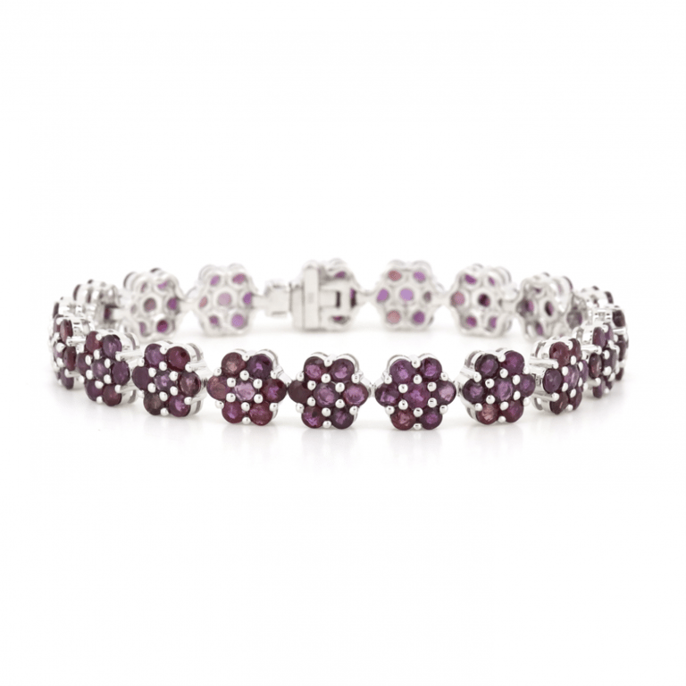 14K WHITE GOLD AND RUBY, FLORAL BRACELET. The Bracelet Features, 113 Round Cut, Medium Purplish-Red, Rubies (19.35Ct Tsw, Minor Eye Visible Inclusions), Claw Set. The Bracelet Features A Box Clasp With A Safety Latch. Bracelet Length Is 18Cm. Valuations Provided by an Independent Third-Party Professional Not Directly Associated With Lloyds Auctions at AUD $$26,890.00This valuation has been conducted by an independent third-party professional. The valuation amount is an assessment by the issuing valuer and does not reflect the auction value of the item. Any inquiries regarding the valuation should be directed to the issuing valuer (refer to contact details on the certificate), as Lloyds Auctions has no affiliation or influence over the valuation, the valuer, or the stated amount. Condition: Good - Refer Images 0645845+1584