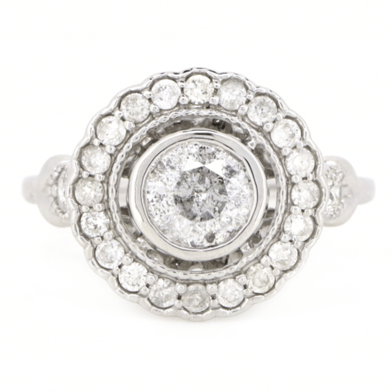 The Centre Features, One Round Brilliant Cut, Diamond (0.73Ct, J-K Colour, I2 Clarity), Bezel Set. Surrounding The Centre In A Halo And Decorating The Shoulders Are, 22 Round Brilliant Cut, Diamonds (0.49Ct Tdw, J-K Colour, Si2-I2 Clarity), Semi-Bezel/Bead Set With Millegrain Detail. Ring Size N 1/2.