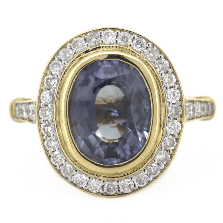 The Centre Features, One Oval Cut, Bluish-Purple, Sapphire (3.43Ct, Minor Eye Visible Inclusions), Bezel Set. Accompanied By, 34 Round Brilliant Cut, Diamonds (0.44Ct Tdw, J-K Colour, Si2-I2 Clarity), Bead Set In White Gold. Ring Size O.