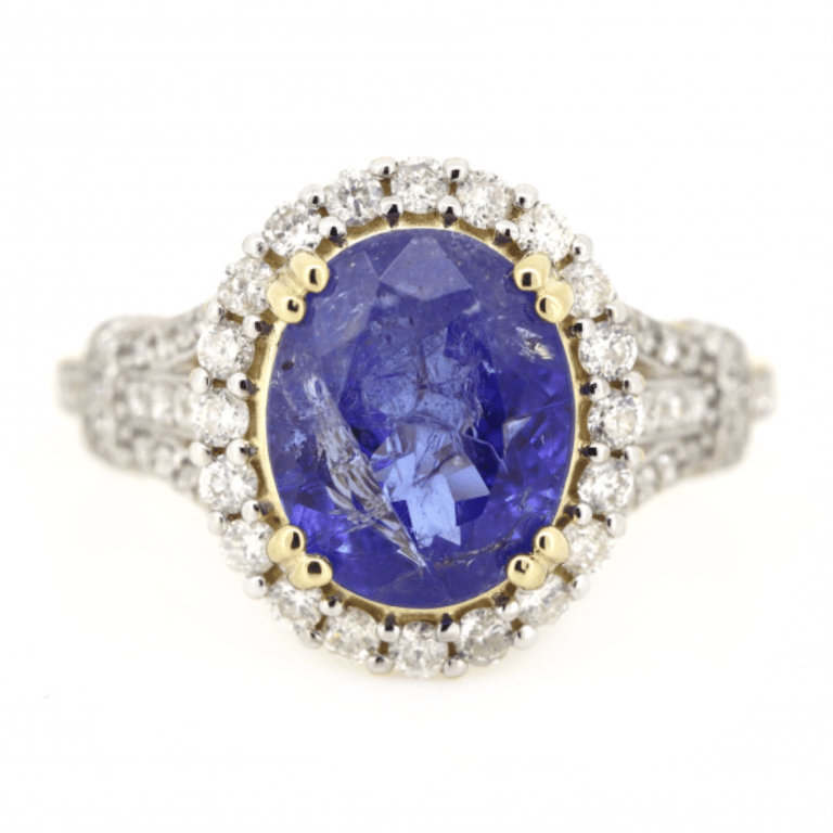 The Centre Features, One Oval Cut, Medium Violetish-Blue, Tanzanite (4.06Ct, Eye Visible Inclusions), Double 4 Claw Set. Surrounding The Centre In A Halo And Decorating The Shoulders Are, 64 Round Brilliant Cut, Diamonds (0.74Ct Tdw, J-K Colour, Si2-I2 Clarity), Micro-Claw/Bead Set In White Gold. Ring Size Q.