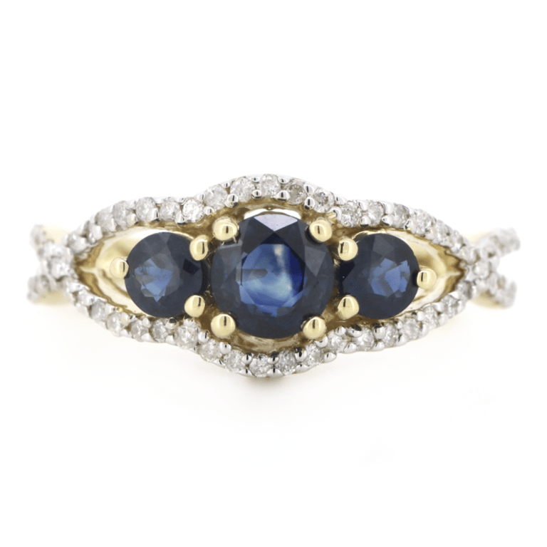 14K YELLOW GOLD, BLUE SAPPHIRE AND DIAMOND, TRILOGY RING.