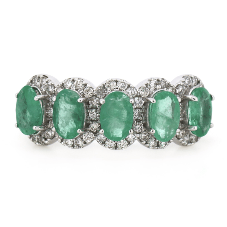 The Centres Feature, 5 Oval Cut, Medium Bluish-Green, Emeralds (1.00Ct Tsw, Included), 4 Claw Set. Surrounding The Centres In Halos Are, 58 Round Brilliant Cut, Diamonds (0.30Ct Tdw, J-K Colour, Si2-I2 Clarity), Micro-Claw Set. Ring Size M.