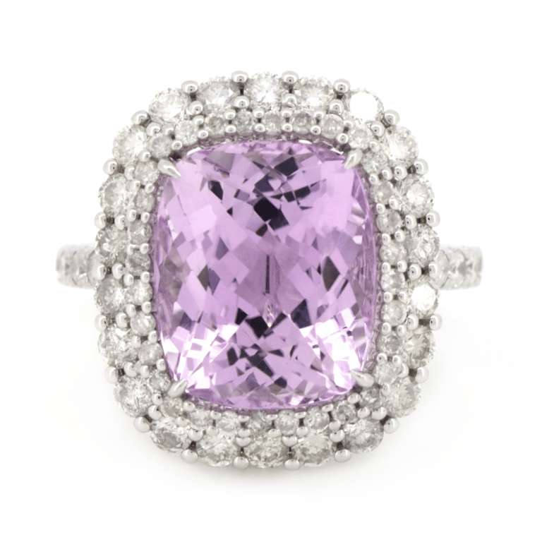The Centre Features, One Cushion Cut, Light Purplish-Pink, Kunzite (7.22Ct, Eye Clean Clarity), Claw Set. Surrounding The Centre In A Double Halo And Decorating The Band Are, 84 Round Brilliant Cut, Diamonds (1.36Ct Tdw, J-K Colour, Si2-I2 Clarity), Micro-Claw Set. Ring Size M.