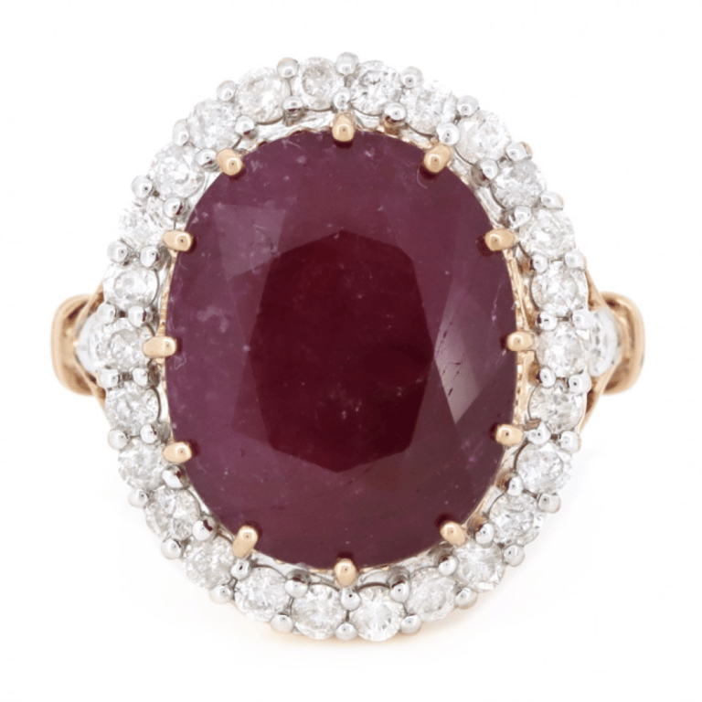 14K WHITE/ROSE GOLD, 10.34CT RUBY AND DIAMOND, HALO RING. The Centre Features, One Oval Cut, Purplish-Red, Ruby (10.34Ct, Included), Multi-Claw Set. Surrounding The Centre In A Halo And Decorating The Shoulders Are, 28 Round Brilliant Cut, Diamonds (0.73Ct Tdw, J-K Colour, Si2-I2 Clarity), Bead/Claw Set In White Gold. Ring Size N. Valuations Provided by an Independent Third-Party Professional Not Directly Associated With Lloyds Auctions at AUD $$17,690.00This valuation has been conducted by an independent third-party professional. The valuation amount is an assessment by the issuing valuer and does not reflect the auction value of the item. Any inquiries regarding the valuation should be directed to the issuing valuer (refer to contact details on the certificate), as Lloyds Auctions has no affiliation or influence over the valuation, the valuer, or the stated amount. Condition: Good - Refer Images 0645845+1557