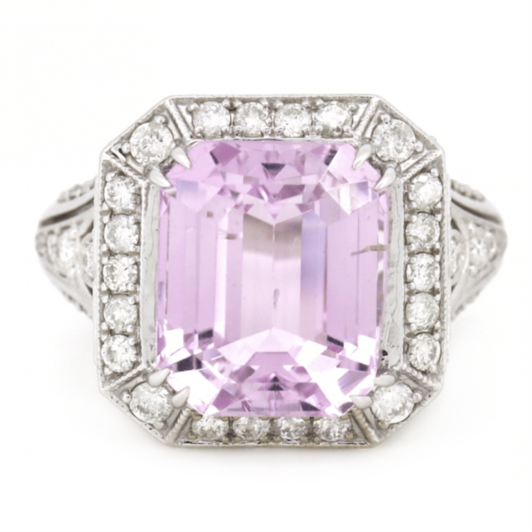 14K WHITE GOLD, 7.71CT KUNZITE AND DIAMOND, COCKTAIL RING. The Centre Features, One Emerald Cut, Pinkish-Purple, Kunzite (7.71Ct, Minor Eye Visible Inclusions), Double 4 Claw Set. Encompassing The Centre Are, 100 Round Brilliant Cut, Diamonds (1.25Ct Tdw, J-K Colour, Si2-I2 Clarity), Bead Set With Millegrain Detail. Ring Size O 1/2. Valuations Provided by an Independent Third-Party Professional Not Directly Associated With Lloyds Auctions at AUD $$9,290.00This valuation has been conducted by an independent third-party professional. The valuation amount is an assessment by the issuing valuer and does not reflect the auction value of the item. Any inquiries regarding the valuation should be directed to the issuing valuer (refer to contact details on the certificate), as Lloyds Auctions has no affiliation or influence over the valuation, the valuer, or the stated amount. Condition: Good - Refer Images 0645845+1540