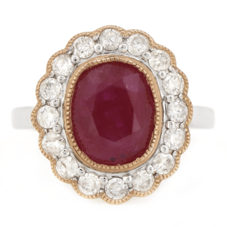 14K WHITE/ROSE GOLD, RUBY AND DIAMOND, HALO RING. The Centre Features, One Oval Cut, Medium Purplish-Red, Ruby (3.65Ct, Included), Bezel Set In Rose Gold With Millegrain Detail. Surrounding The Centre In A Halo Are, 16 Round Brilliant Cut, Diamonds (0.74Ct Tdw, J-K Colour, Si2-I1 Clarity), Semi-Bezel/Bead Set In Rose/White Gold With Millegrain Detail. Ring Size N. Valuations Provided by an Independent Third-Party Professional Not Directly Associated With Lloyds Auctions at AUD $$13,890.00This valuation has been conducted by an independent third-party professional. The valuation amount is an assessment by the issuing valuer and does not reflect the auction value of the item. Any inquiries regarding the valuation should be directed to the issuing valuer (refer to contact details on the certificate), as Lloyds Auctions has no affiliation or influence over the valuation, the valuer, or the stated amount. Condition: Good - Refer Images 0645845+1566