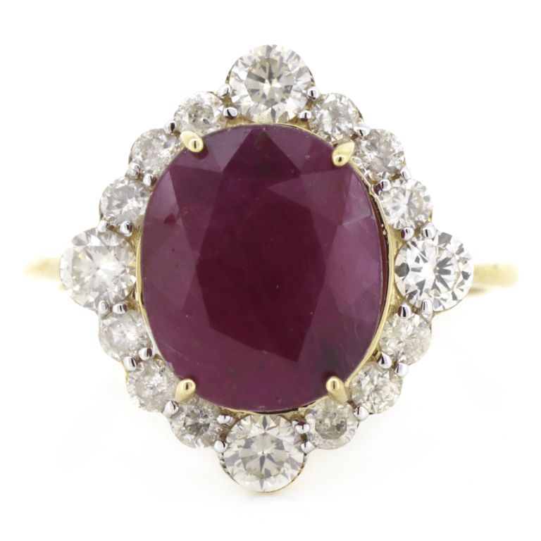 The Centre Features, One Oval Faceted Cut, Medium Deep Pinkish-Red, Ruby (6.49Ct, Included, Enhanced), 4 Claw Set. Surrounding The Centre In A Halo Are, 16 Round Brilliant Cut, Diamonds (1.18Ct Tdw, J-K Colour, Si2-P2 Clarity), Claw Set. Ring Size Q 1/2.